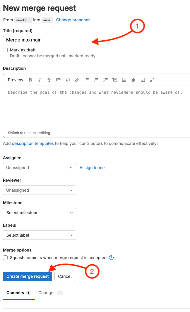 You will be presented with the screen to the right. This is the merge request form for GitLab. See the different fields that are available. You can add reviewers, assignees, labels, etc. You can also add a description of the merge request. This is a good practice to add a description of the changes that you are making. This will help the reviewers understand what you are doing and why.